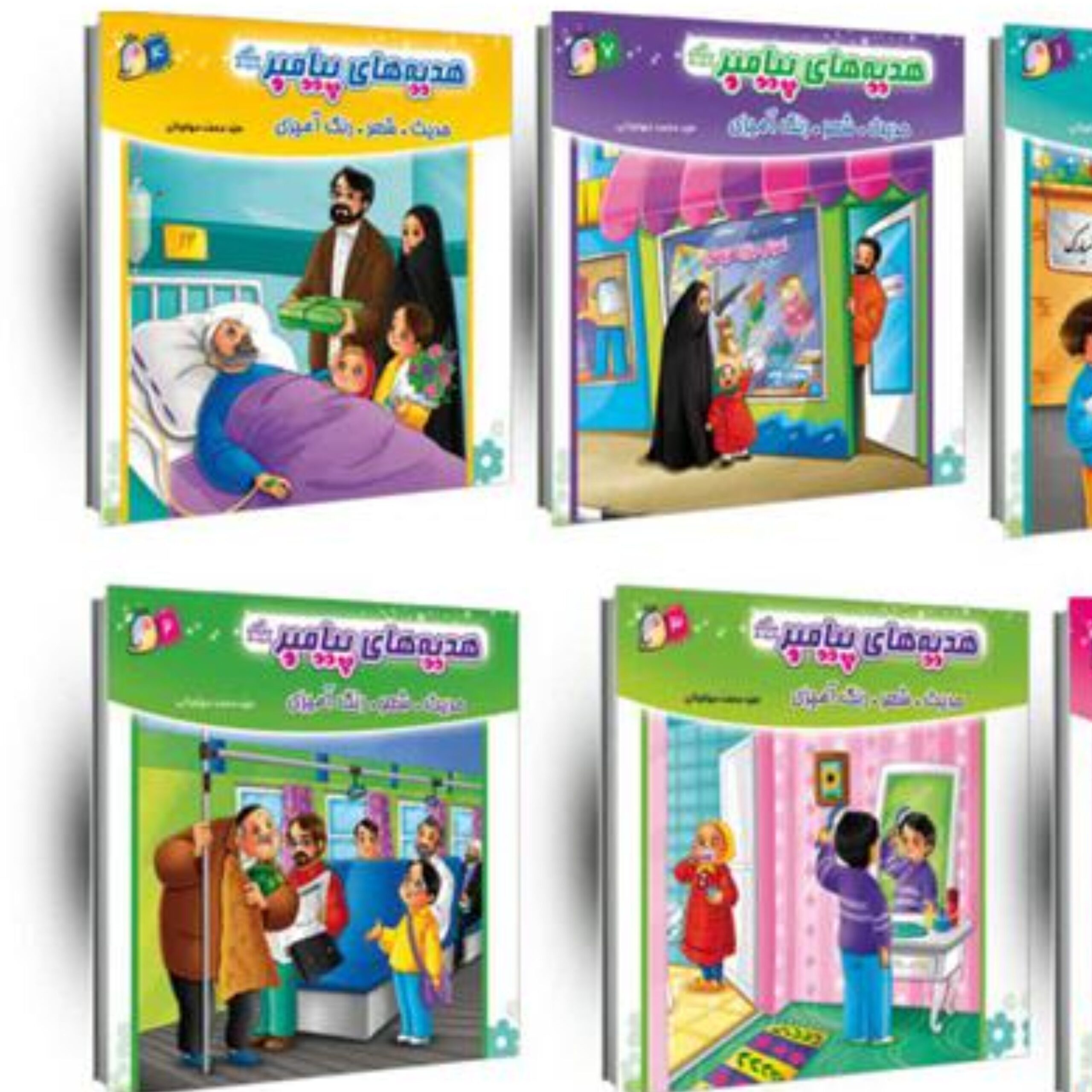 🌸در هر جلد از مجموعه کتاب هدیه های پیامبر ص پنج حدیث با شعری کوتاه و تصویری زیبا آمده و بخشی از تصاویر برای رنگ آمیزی کودکان طراحی شده است.